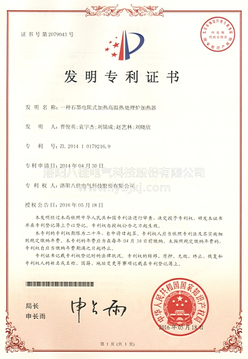 由我公司自主研發的“一種石墨電阻式加熱高溫熱處理爐熱場”、“一種石墨電阻式加熱高溫熱處理爐加熱器”,近日取得了中華人民共和國國際知識產權局頒發的發明專利證書。專利號分別為:ZL 2014 1 0179417.9 和ZL 2014 1 0179216.9
